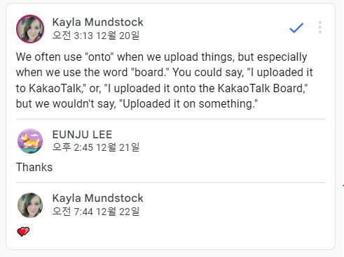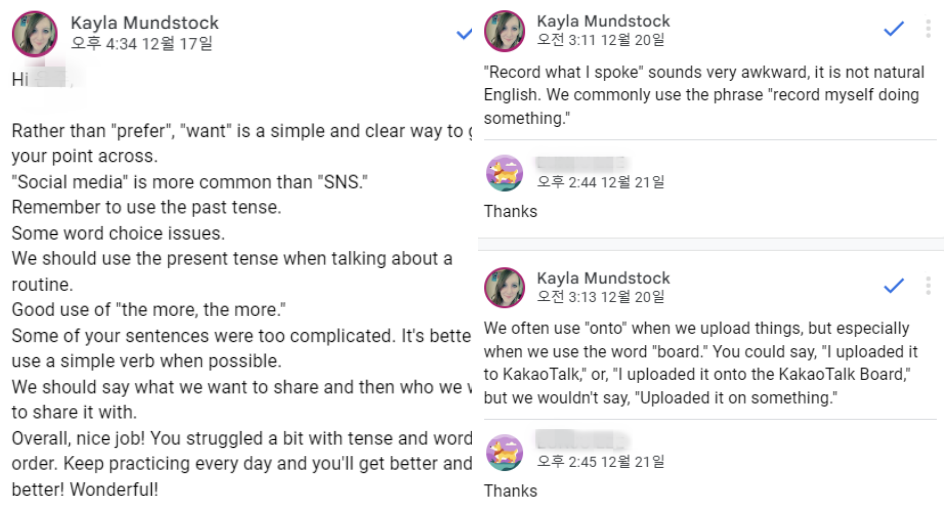 Hi, this is Teacher Kayla and I'm in charge of corrections! I have been an English teacher in Korea for over 10 years, so I'm very familiar with the common mistakes that Korean students often make. I will not only correct your grammar but also provide explanations and new expressions for you to use. My goal is not to pick apart your writing, but to help you use English more naturally. I'm looking forward to studying with you soon!