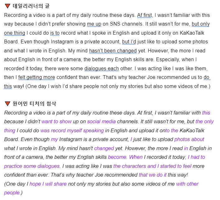 완성된 영어 결과물만 제시하지 않습니다. 내 영어를 그렇게 바꾼 이유도 함께 설명합니다. 물론 영어로 코멘트를 달아주니, 원어민이 쓴 코멘트를 읽는 것만으로도 내 영어에 도움이 됩니다. 이걸 모아서 정리하면 나만의 ‘영어 오답노트’가 되겠죠?