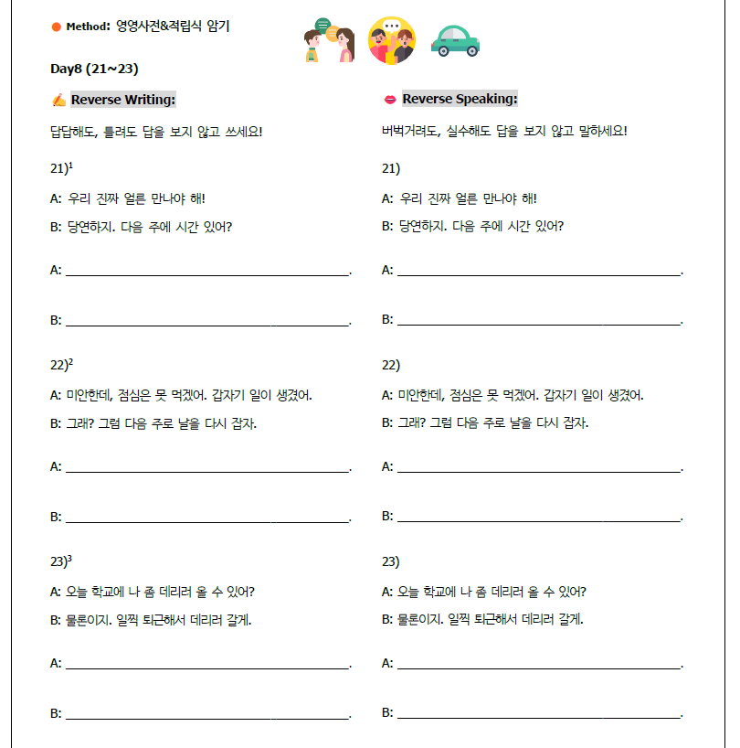 아래 이미지는 챌린지 자료 맨 마지막에 있는 '반복 코너'입니다. 어제 암기한 문장을 반복하는 것에 그치지 않고